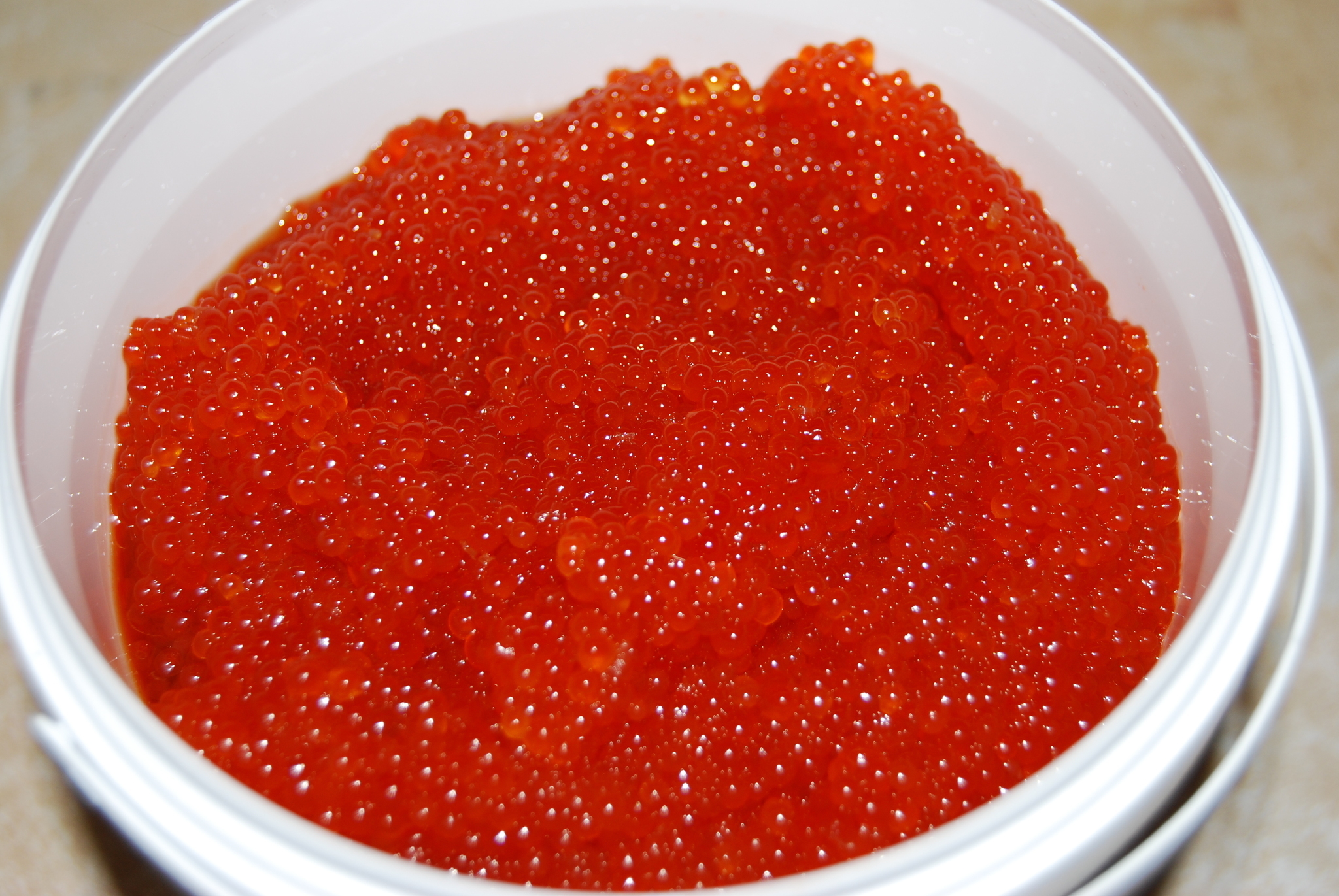 Через некоторое время лососевую икру начали солить пробойным способом, так же как солили в старину икру частиковых рыб.