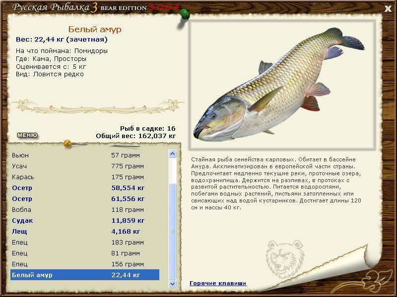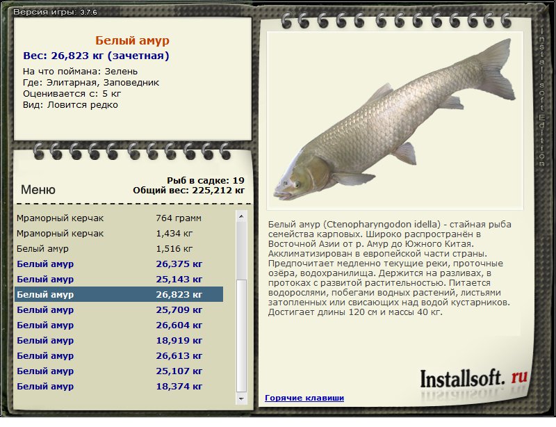 Что касается температуры воды, то амур активно кормится и отлично клюет при температуре +19…+22° С. И даже при температуре выше +22° С, в отличие от многих других рыб, не утрачивает активности.