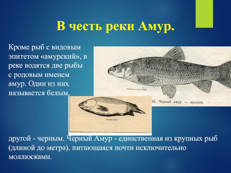 Белый и чёрный амуры. Завершим первую часть статьи ещё двумя дальневосточными видами. Оба всё из той же реки Амур. Вселение началось в 60-е годы. Белый — более распространённый вид, встречается во многих водоёмах края. Чёрный – в большей степени искусственно разводимый, но есть и вольные стада. Обеих рыб не только едят, но и ещё используют как “биологическое оружие”. Белый амур травоядный и хорошо уничтожает водную растительность. Сейчас его часто применяют для расчистки лиманов. К сожалению, есть и минусы. В некоторых водоёмах он выедает всю зелень, тем самым разрушая места обитания и размножения других видов. Чёрный амур ест моллюсков, в том числе и улиток, который являются хозяевами личинок гельминтов и так контролируют численность паразитов.