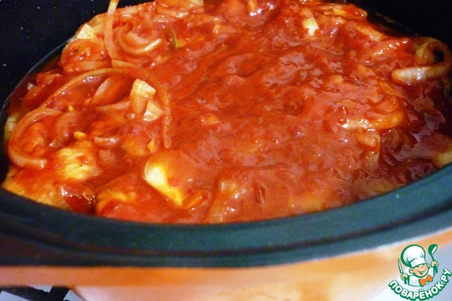 Выложить слоями судака и томатный соус