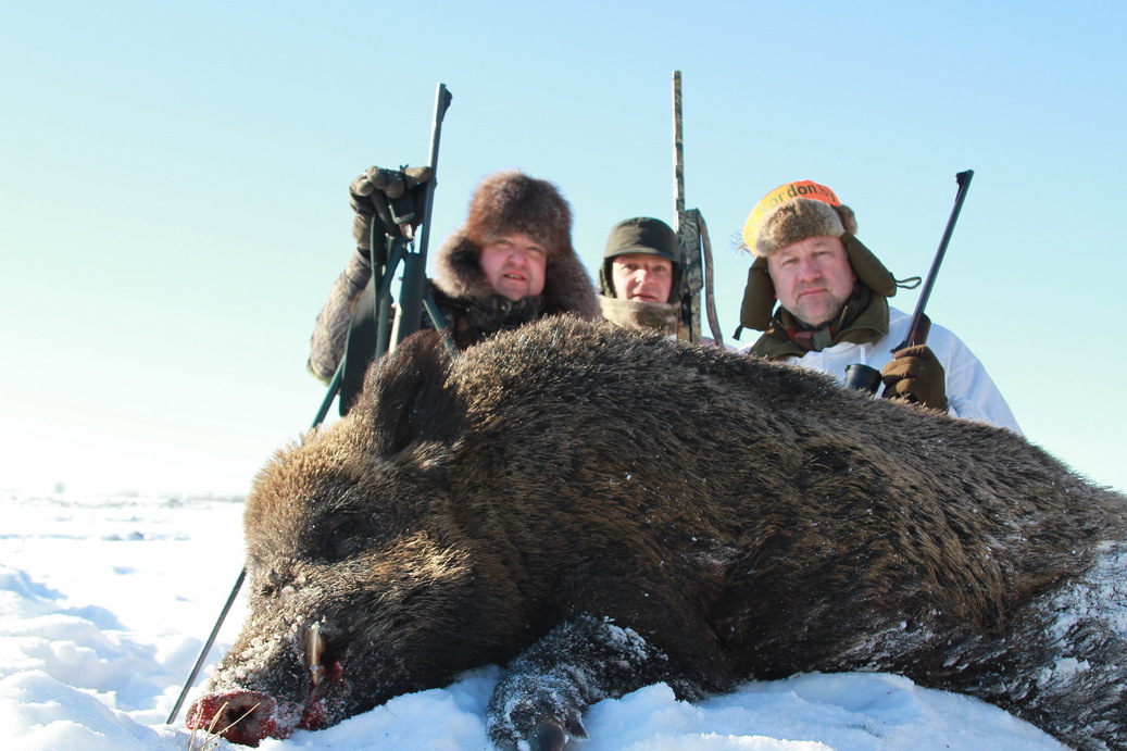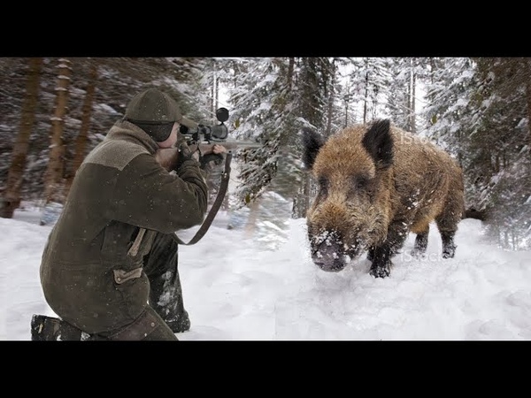 Выбрав цель, охотник производит точный выстрел, кабан падает не сдвинувшись с …