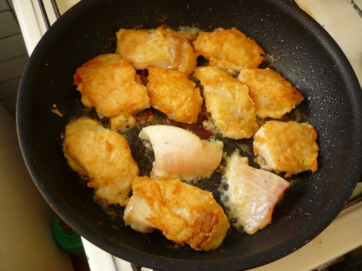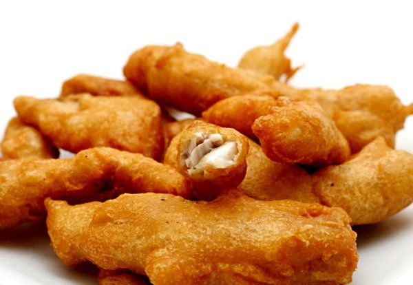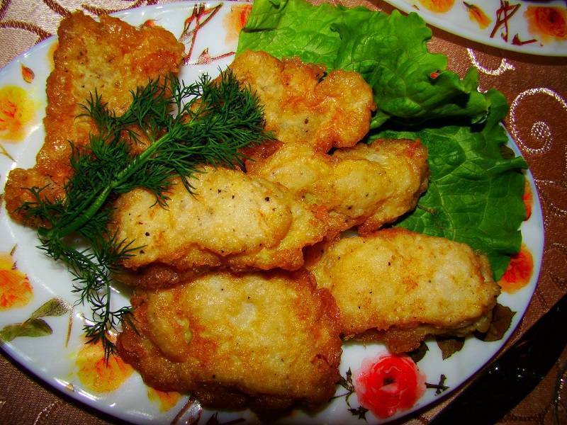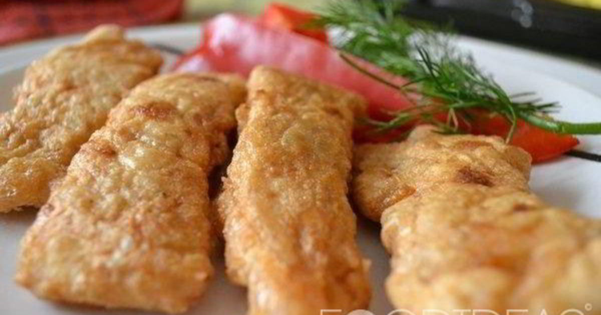 Приготовление: Взбей яйца с теплым молоком и постепенно добавь просеянную муку. Рыбу нарежь на ломтики, обваляй в специях, а потом в кляре, и обжарь.