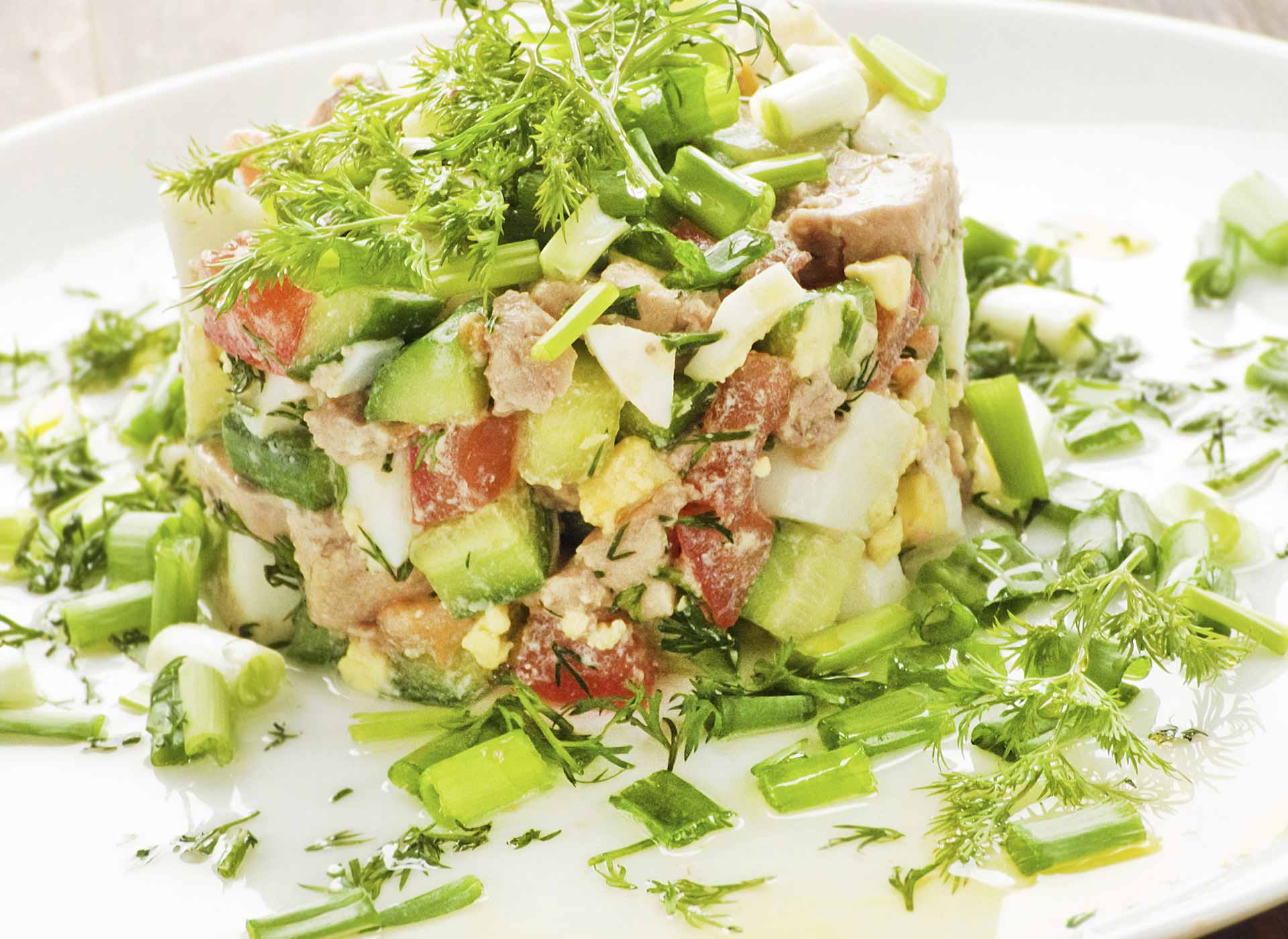 Рецепт, в котором все точно так же, как и в классическом салате, но зеленый лук заменяем на мелко рубленный репчатый и кусочки чернослива. Не удивляйтесь! Нестандартный поворот с этими сладкими сухофруктами сделает рыбное блюдо еще нежнее.
