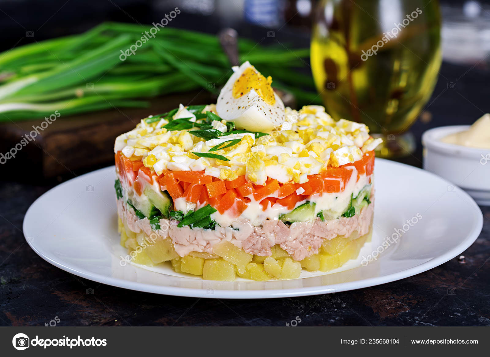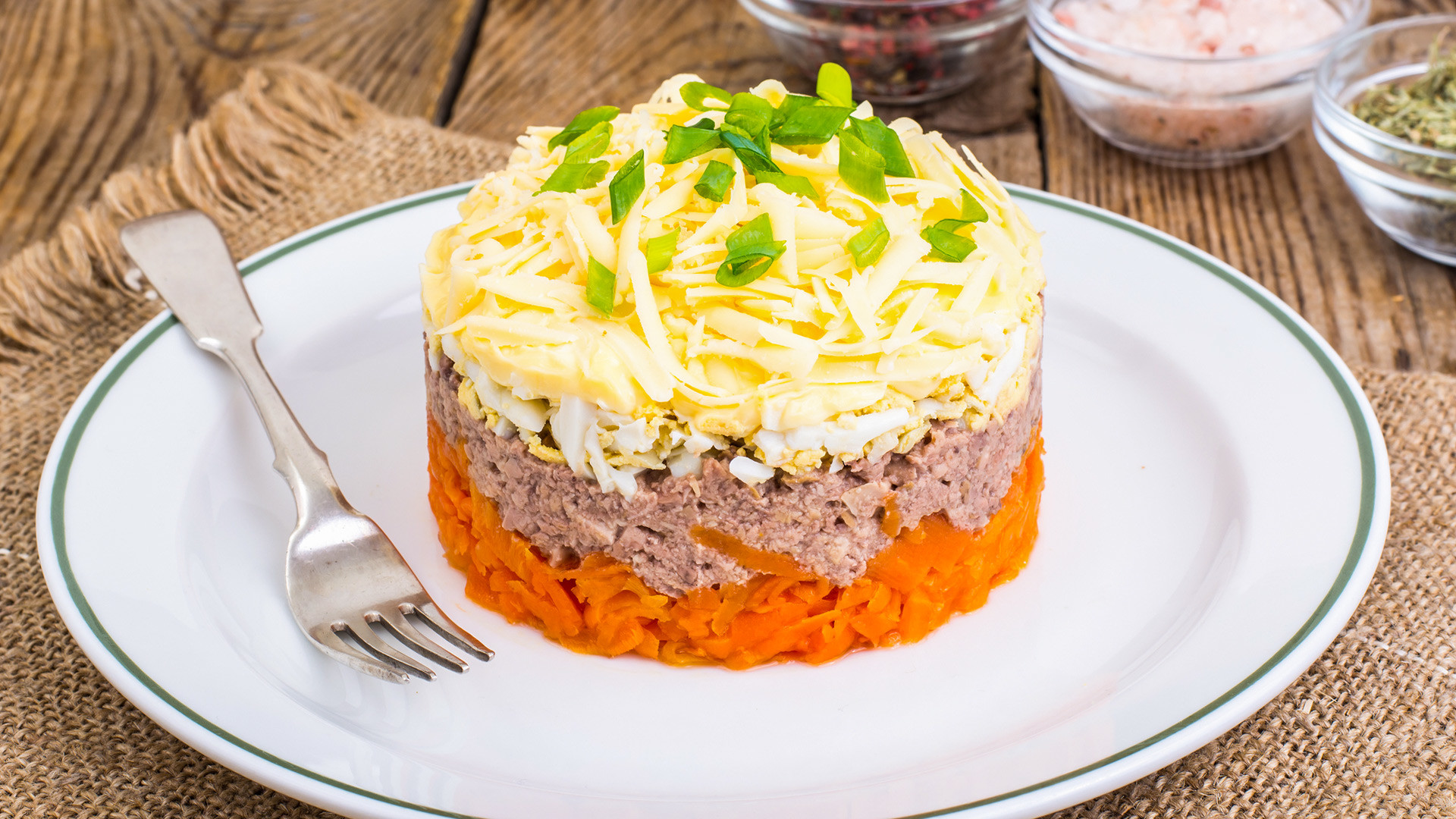 Первый рецепт – классический послойный и очень вкусный салат из печени трески – потребует большого блюда и разъемной формы для выпечки