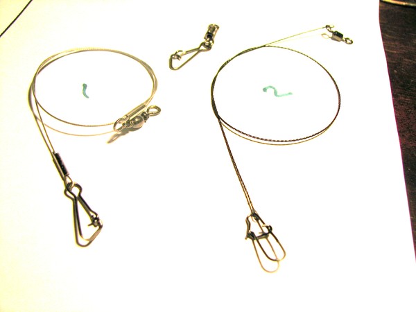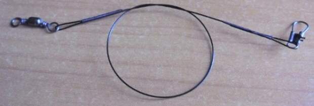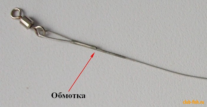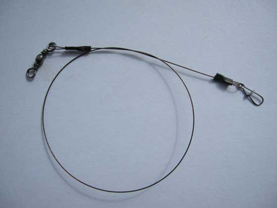 - На поводок со стороны шнура необходимо ставить либо вертлюг, либо зажимное кольцо, либо карабин, так как проволока довольно тонкая, узел на шнуре пережигает сам себя.