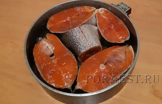2. Разогреть на сковороде растительное масло, выложить стейки форели.