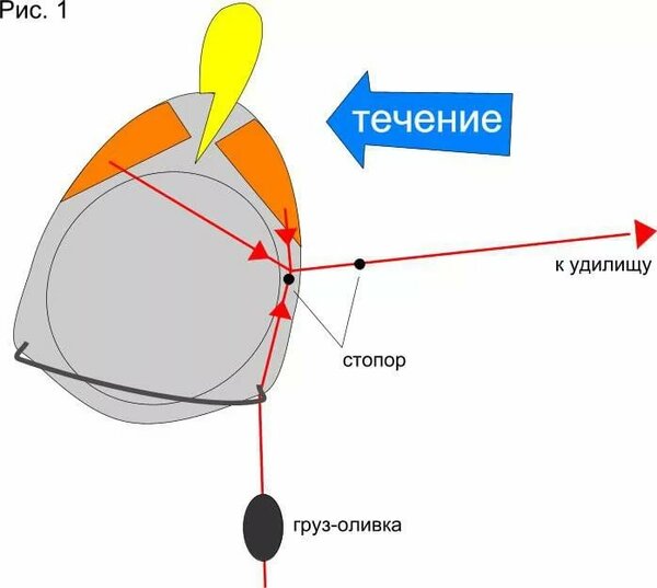 Поплавок сохраняет вертикальное положение, а вот крючок попросту болтается в струях течения где-то в средних слоях воды. Вряд ли тут стоит рассчитывать на поклевку донной рыбы, но если даже она и случится, то вы, скорее всего, ее не заметите.