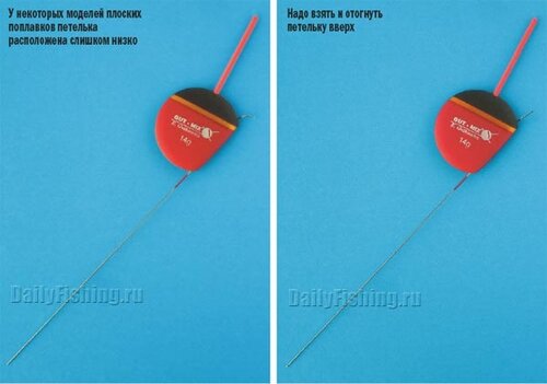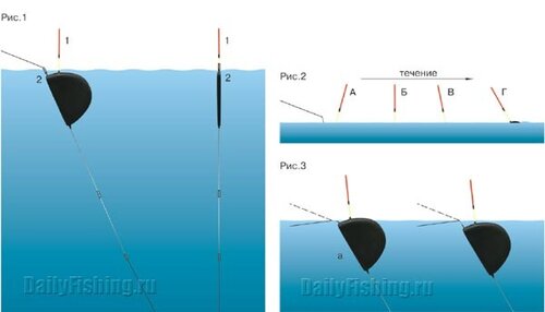 Обычный поплавок той же грузоподъемности, что и плоский, тоже можно остановить на течении, но оно частично выдавит его из воды и придаст ему наклонное положение. Леска еще больше отклонится от вертикали, и чувствительность всей оснастки уменьшится во много раз.