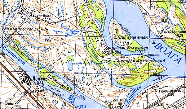 Вернемся к селу Селитренное и рассмотрим участок вблизи слияния Ашулука, Средней Ахтубы и Мангута ( на карте он фигурирует как Криуша ).