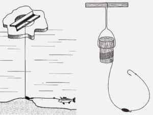 Слабо плывущий предмет привязывают к сильному и закрепляют на берегу или на ледовом столбе (это может быть дощечка, рогатка, кусок шланга).К нему прикрепляется жила и пропускается через прорезь в воду. На жилу устанавливается подвижный груз, который состоит из карабина (чаще всего это вертлюжок), металлического поводка с оплеткой и комбинации крючков: полиспаста, двойника или тройника.