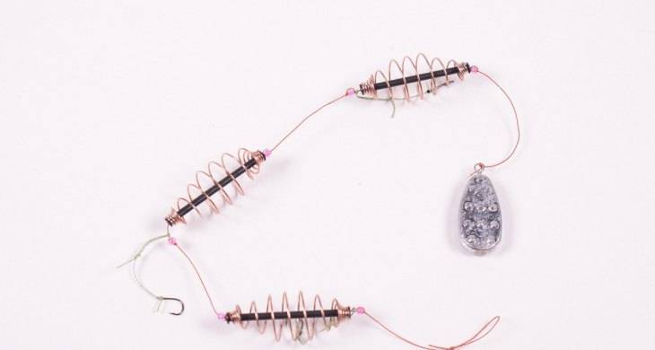 Это очень эффективная, хотя и травмоопасная для рыбы, снасть, своеобразная комбинация фидерной оснастки и ниппеля. В целом это набор из нескольких пружинных кормушек с короткими поводками и крючками, соединенных друг с другом леской. Купить снасть проблематично, так как она не считается спортивной, но хорошо, что убивалка карасей и карпов без проблем делается своими руками. Здесь мы научим вас вязать.