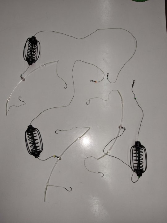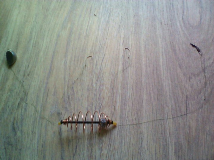 - Три пружинистых кормушки без дополнительной огрузки. Хорошо, если пружины будут оснащены полой трубкой для их нанизывания на шнур. Это значительно упростит изготовление снасти. Если ее нет, кормушку следует зафиксировать узлами на шнуре.