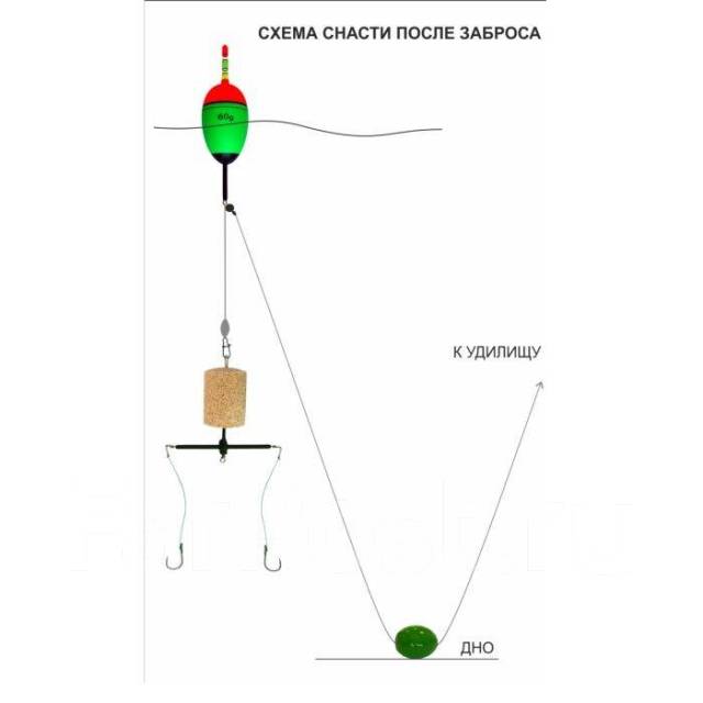 Важный элемент снасти — поплавок. Его размеры впечатляют. Он большой и грузоподъемный. Ловля происходит на дальних дистанциях, а яркий и габаритный объект будет заметен на воде издалека.