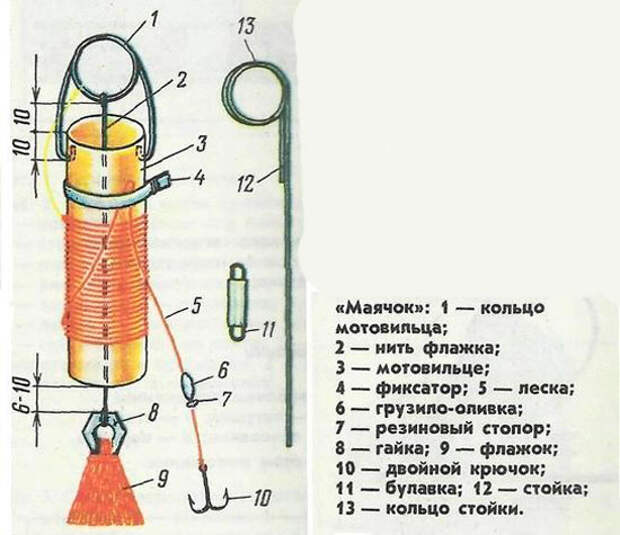 - конструкцию не пугающую рыбу при срабатывании флажка при ловле на малых глубинах (1-2 метра), для больших глубин это не существенно
