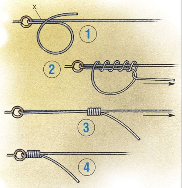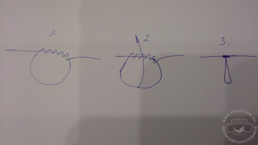 Для данного варианта необходимо не только сделать петельку на главной леске. Ещё надо обернуть свободный конец вокруг одного из её краёв. Сделать это необходимо, по крайней мере, три раза.