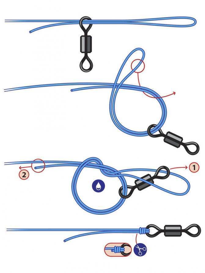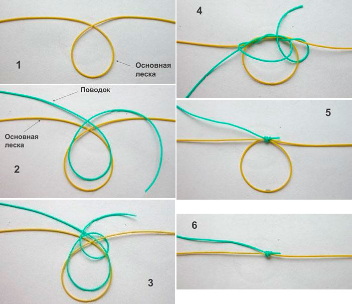 Такая петля формируется на поводке и на конце основной лески, а затем они соединяется между собой. Сама петля делается простым или двойным узлом, либо узлом “восьмерка”.