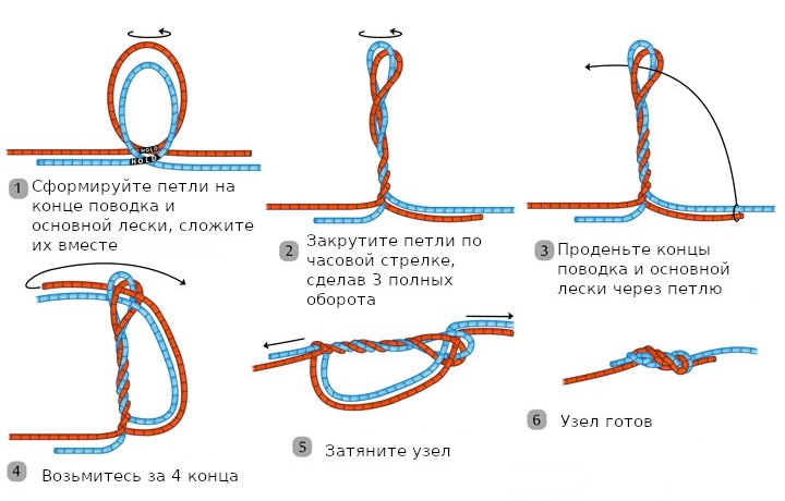 Связать поводок и основную леску, можно любым из узлов для связывания лески между собой.