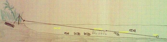 - Снасть разматывают на берегу, к резинке посредством шнура из капрона крепят груз.