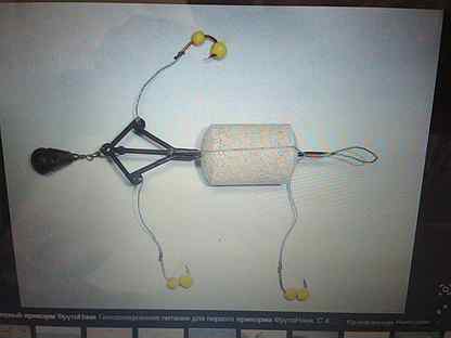 Принцип работы этой приманки очень простой. Цилиндр, из прессованной мелкофракционной смеси, цепляется на специальное коромысло, изготовленное из стальной проволоки.