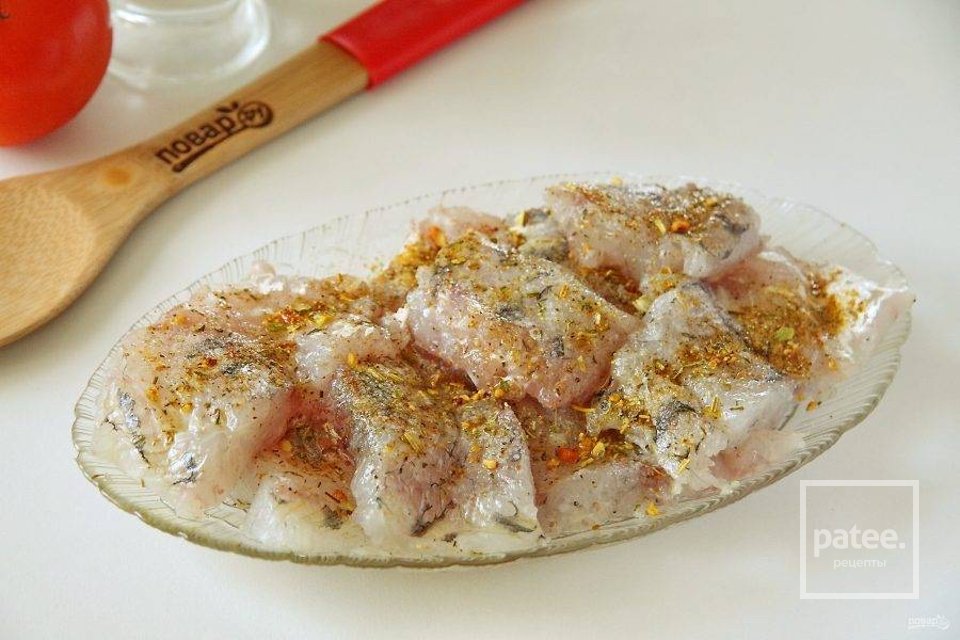 - Филе нарезать кусками по 5 см, посолить, поперчить.