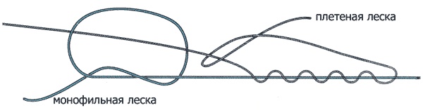 - Полученной петлей огибаем основную леску и в получившуюся петельку продеваем двойной конец лески