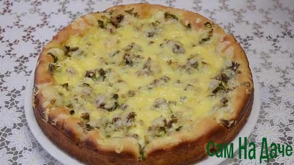 - За пять минут до окончания, достаньте форму, посыпьте пирог мелко потертым сыром. Верните в печь, закончите приготовление.
