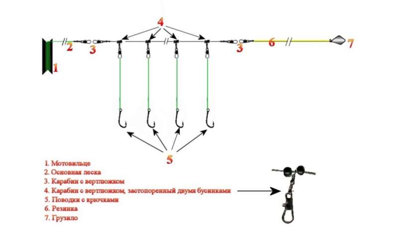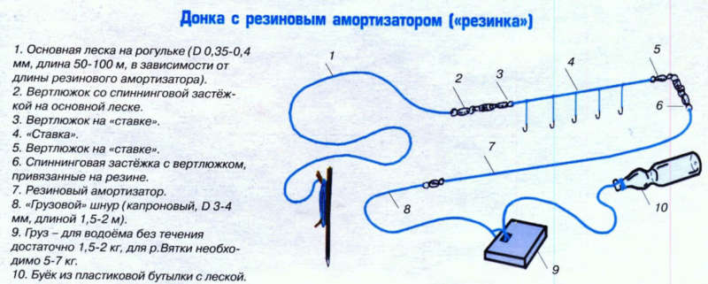 На пятиметровую леску понадобиться 1 метр резинки – так рассчитываем коэффициент натяжения. Поводки для резинки берите с флюорокарбона размером 0,2-0,23 и 15-25 см. Груз лучше покажет себя широкой формы, например, в виде ложки или любой геометрической фигуры, он должен лечь плашмя на дно и не снестись течением. Весом не более 200 гр. и 15 см. в диаметре.