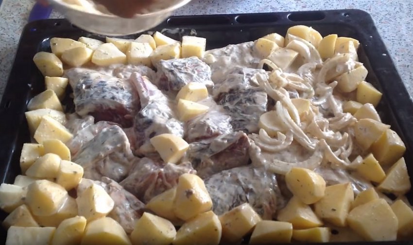 Потребуется два маринада: лимонный для рыбы и чесночный для шампиньонов. Картофель нужно отварить до полуготовности и обмазать сметанным соусом. Соединяем все составляющие блюда на противне и ставим в духовку для запекания.