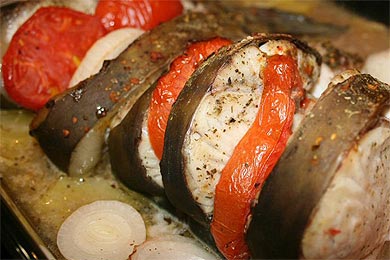 Если хотите приготовить рыбу с картофелем (или смесью овощей) на одном противне, разогрейте духовку до 210 С (425 F). На противень уложите дольки картофеля, смешанного с оливковым маслом, солью и, по желанию, травами и специями (паприка, черный перец, чеснок, гранулированный лук, тимьян, розмарин). Пока рыба маринуется, запекайте картофель в духовке примерно 15 минут. Затем понизьте температуру духовки до 200 С (400 F). Сдвиньте картофель на одну сторону противня, уложите рыбу рядом и запекайте примерно 20 минут, или до готовности рыбы и картофеля.