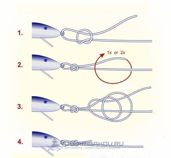 Что конкретно к чему лучше подойдет, зависит в первую очередь от нашей лески или шнура. Для начала можно привязать поводок обычным узлом, но не поленитесь сразу проверить этот узел на разрыв. Если прочность недостаточна – пробуйте другие варианты, пока не найдете нужный.