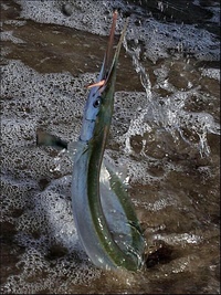 Интересный способ плавания – посредством волнообразных сгибов тела. Резко выпрыгивает из воды. Плавает на большой скорости.