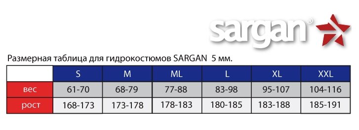 (*) – данные гидрокостюмы для подводной охоты производят только размеров S, M, L, XL и XXL