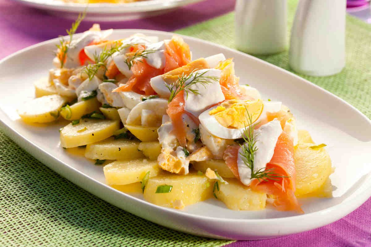 Салат с вареной рыбой и картошкой может быть как совсем простым, так и праздничным, изысканным. Например, можно приготовить салат из вареной красной рыбы (семги, лосося) и креветок.