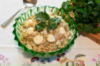- В готовый салат из вареного картофеля с рыбой добавить зеленый горошек, но его должно быть немного, иначе блюдо может получиться суховатым.