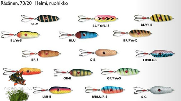 Rasanen предлагает отличный набор разнообразной окраски. Медные, серебристые, латунные, синие блесны, блесны с металлической полоской — гарантия успешной рыбалки в самых разных условиях. Новые цвета стоит пробовать при ухудшении поклевки, изменении погоды, и вообще — время от времени. Кто не пробует разных блесен, тот зависит от воли случая. Rasanen — надежная многоцелевая блесна.