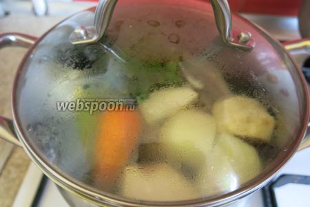 Вернуть основу супа на плиту и закинуть мелкие кубики картофеля и крупно тертую вторую морковь (ее можно порезать тонкими кружочками).