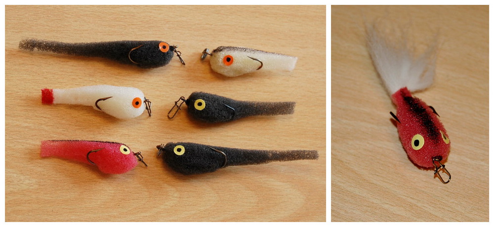 Также в продаже можно встретить готовые поролонки. Большинство из них выполнены в форме малька и раскрашены под небольшую рыбку, они выглядят гораздо лучше самоделок, но на уловистость это не влияет.