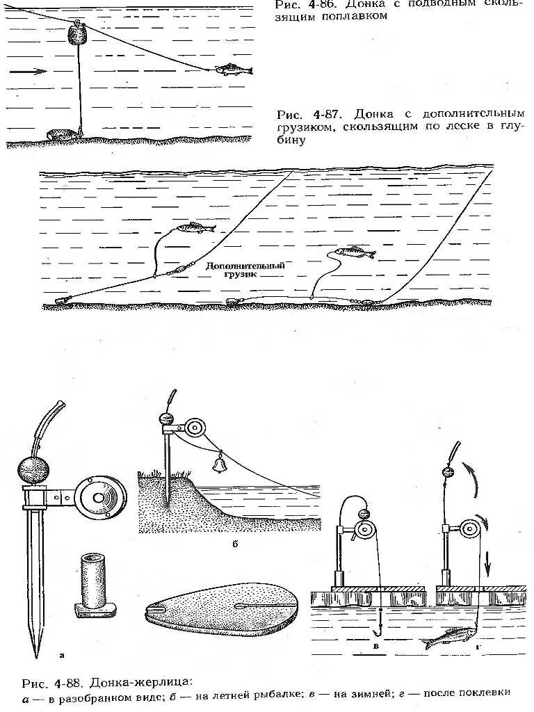 Когда они все имеющиеся в наличии конструкции установлены, осматривают снасти и ждут, пока одна из них сработает. При ловле на течении рыба зачастую сама проглатывает крючок, не нуждаясь в подсечке.