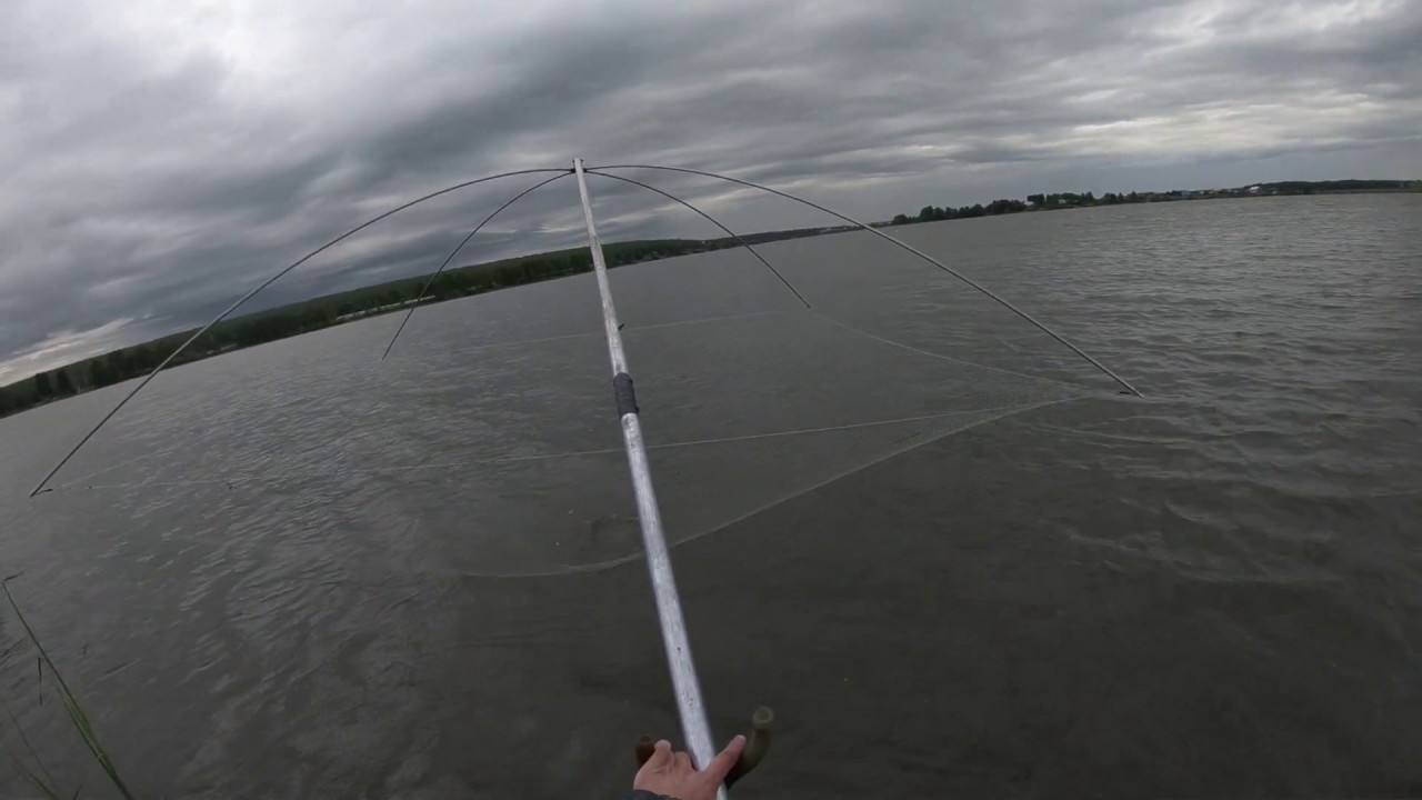 На реке провел испытания этой рыболовной любительской снасти. Конструкция которой состоит из 4 стальных прутика с крестовиной,и с сеткой размером 1,8*1,8 м с ячейкой 24 мм. Погода переменчива дул сильный порывистый ветер в районе ” м/с” хорошо что камера не чувствительная на ветер,увидел 3 щуки