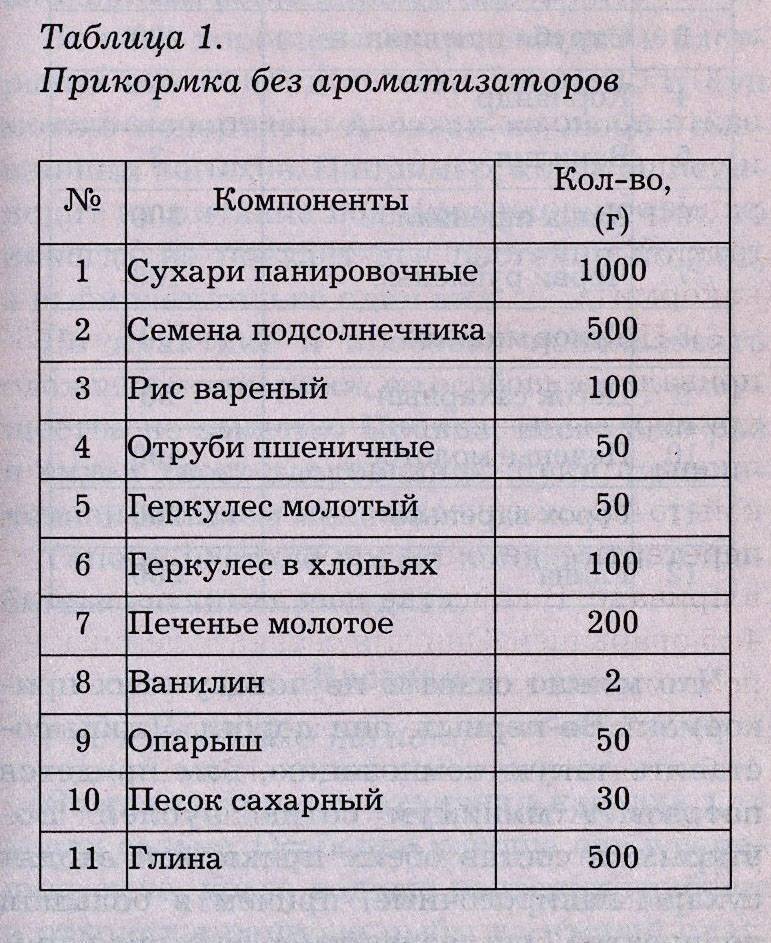 Основную часть прикормочной смеси составляют крупные и средние частицы. Ингредиенты подбирают таким образом, чтобы кормушка продолжительное время оставалась наполненной.