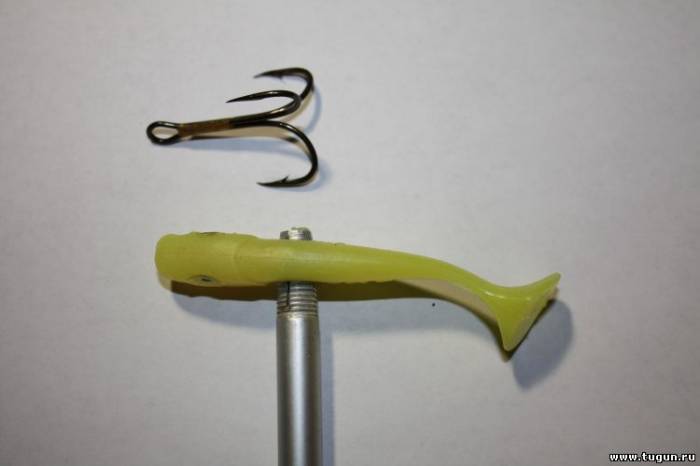 Берем, к примеру, виброхвост нужного размера и подходящий к нему двойной крючок. Прикладываем и отмечаем место, где должен выйти жало крючка наружу из тела приманки.