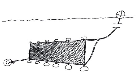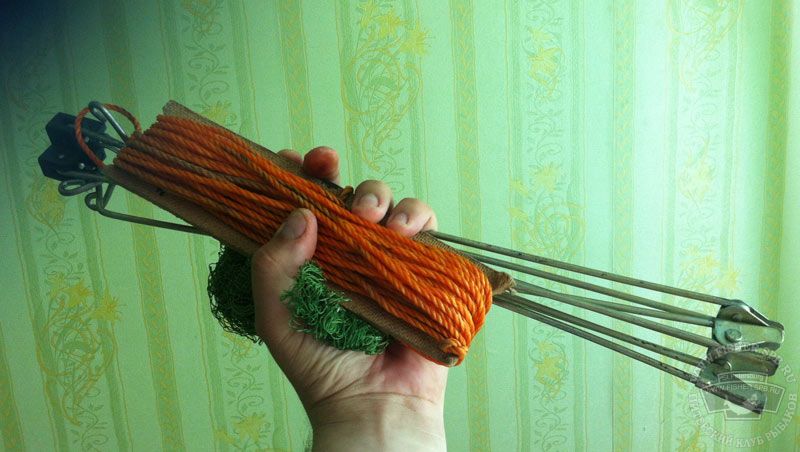 Другие стороны треугольника из сетки укреплены продетым через ячею прочным капроновым шнуром или толстой леской (от мм и выше). К верхнему углу треугольника крепится шнур, служащий для опускания этого приспособления на нужную глубину и его подъема по истечении определенного времени.